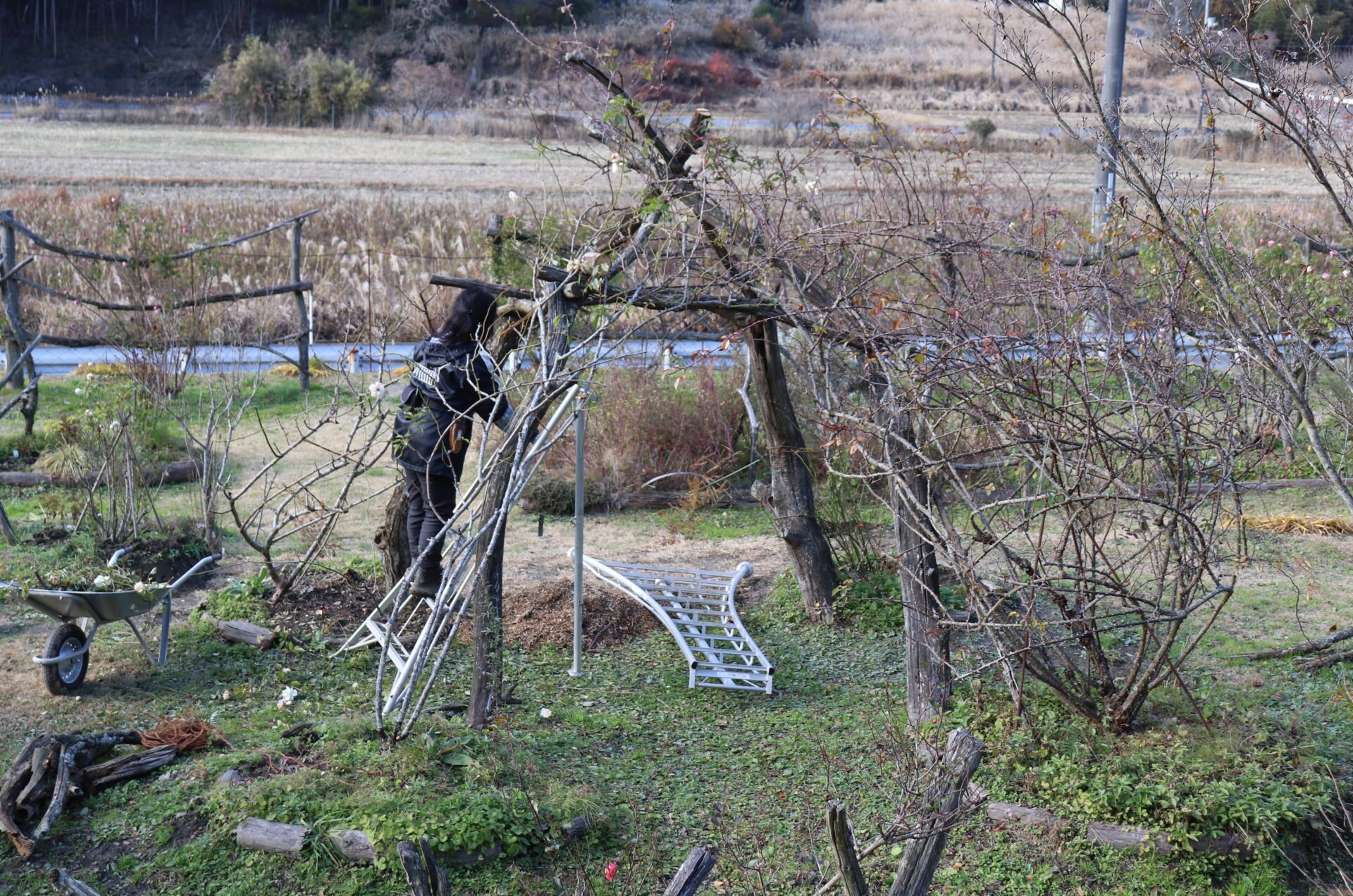 妻は大物のツルバラから剪定。冬になっても咲こうとするバラの蕾を摘んで飾り、楽しんでもいます。「半働半楽」これでなきゃあ続きません!