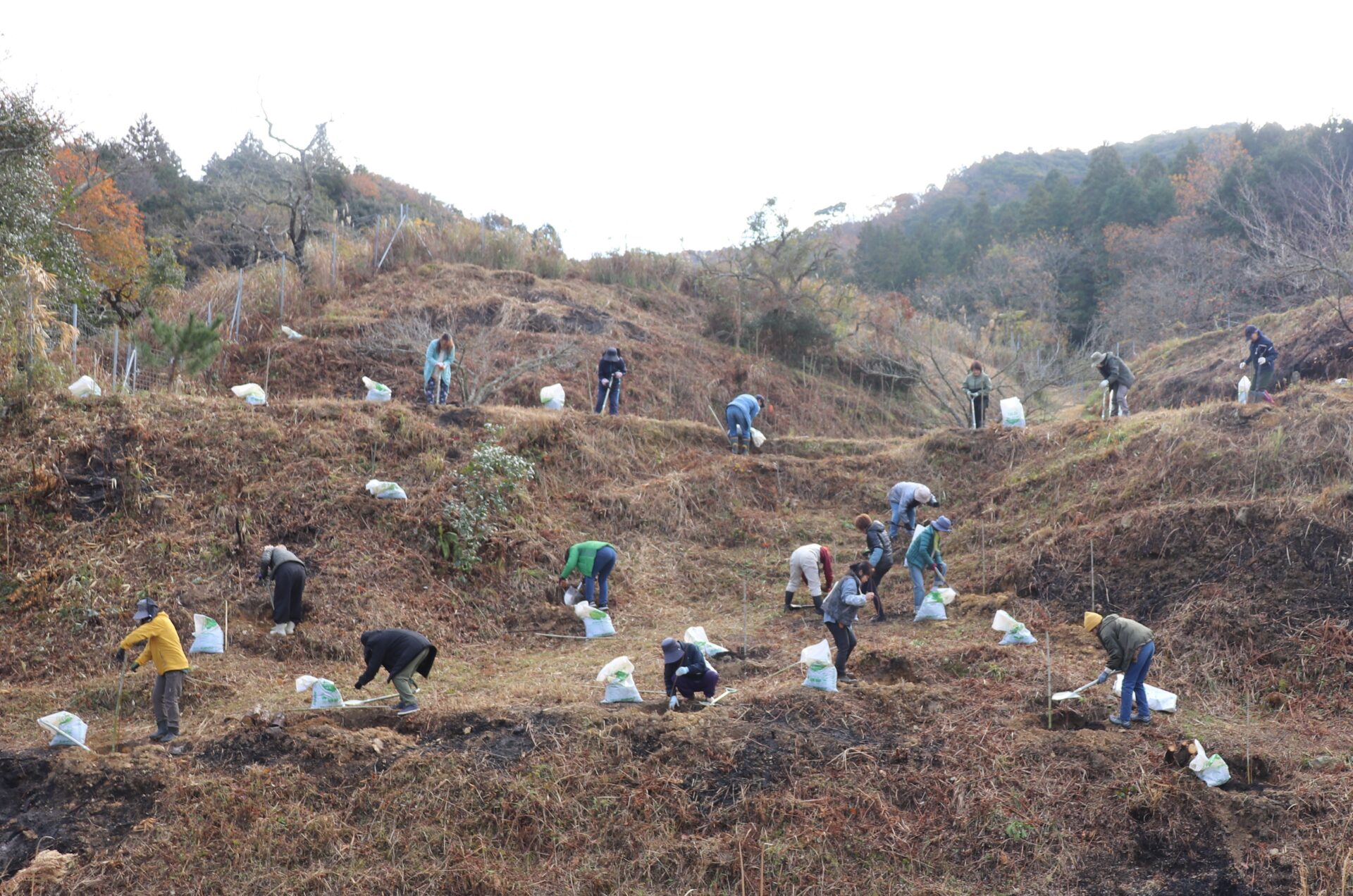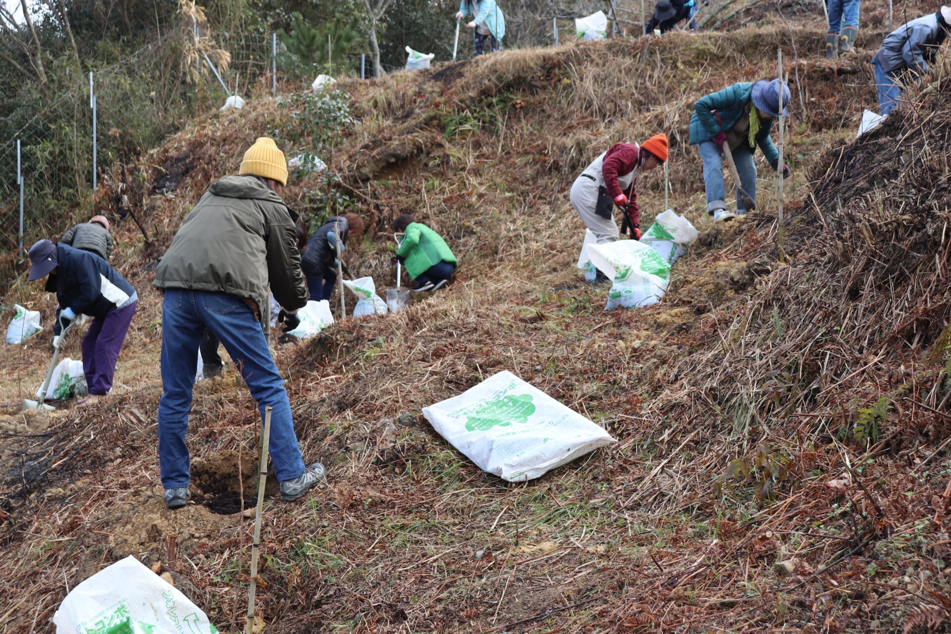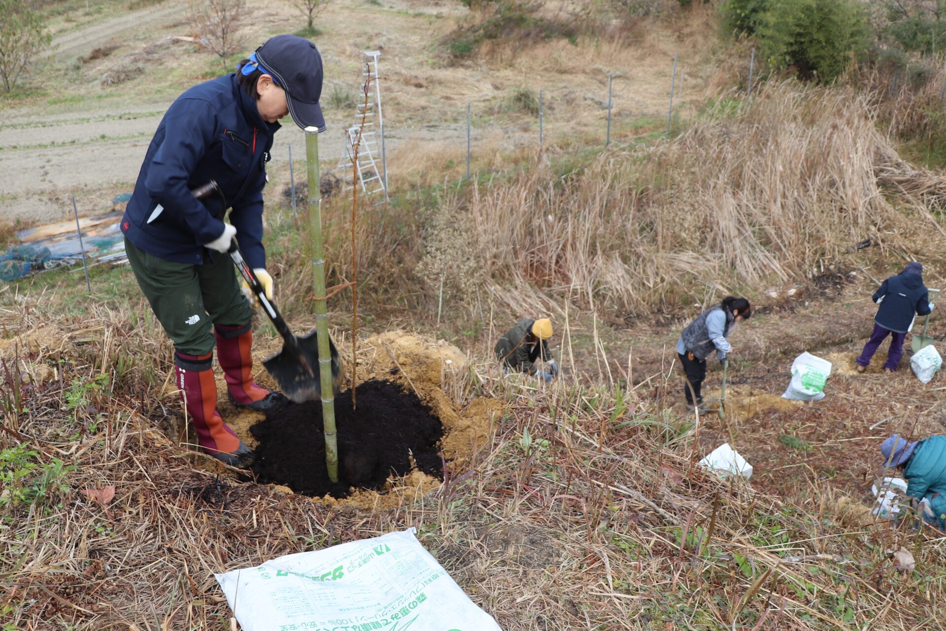 長さ1m程度の苗木を丁寧に25本植栽しました。また、強風対策の竹支柱設置や有機堆肥のマルチングも行いました。これなら100%育つと思います。