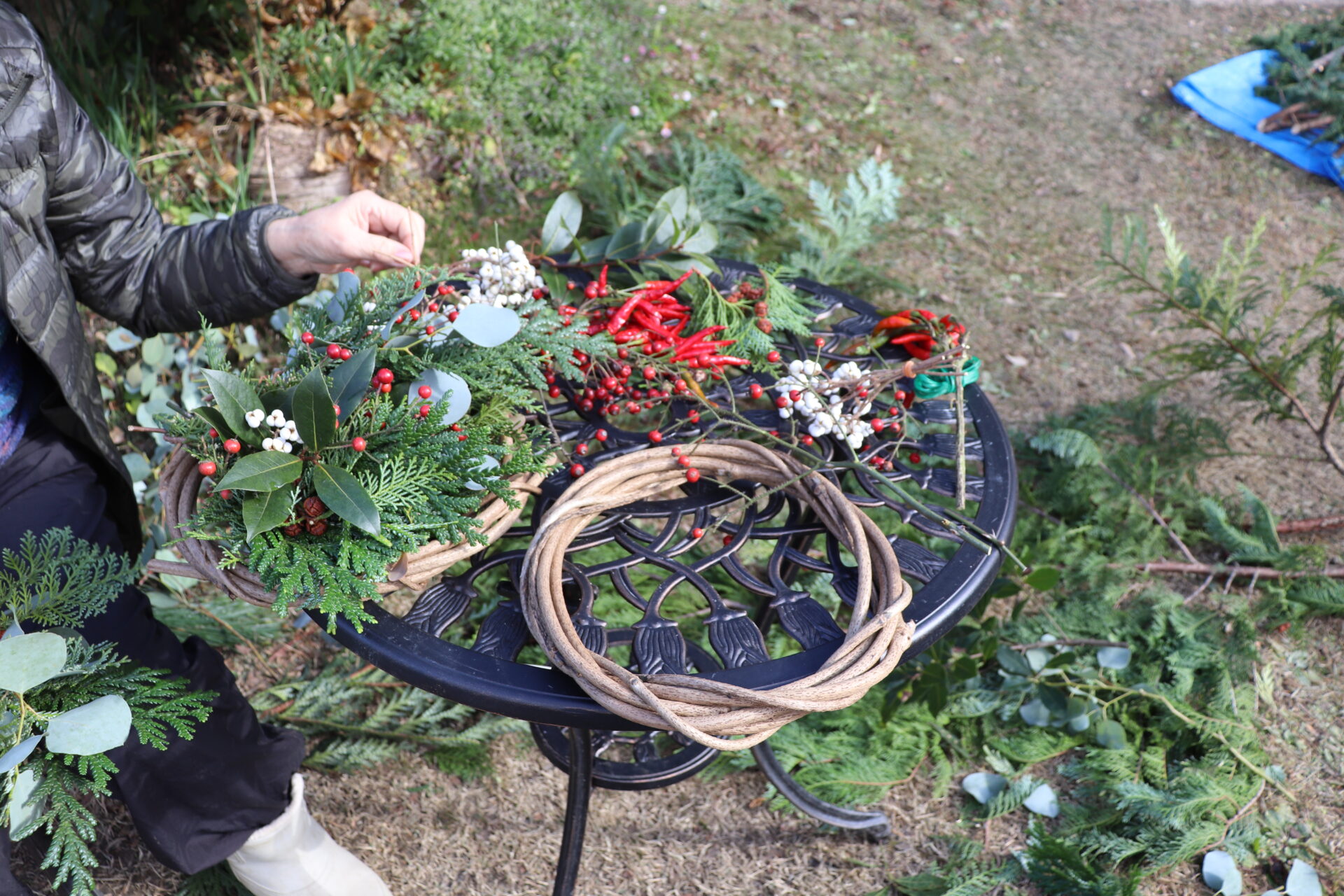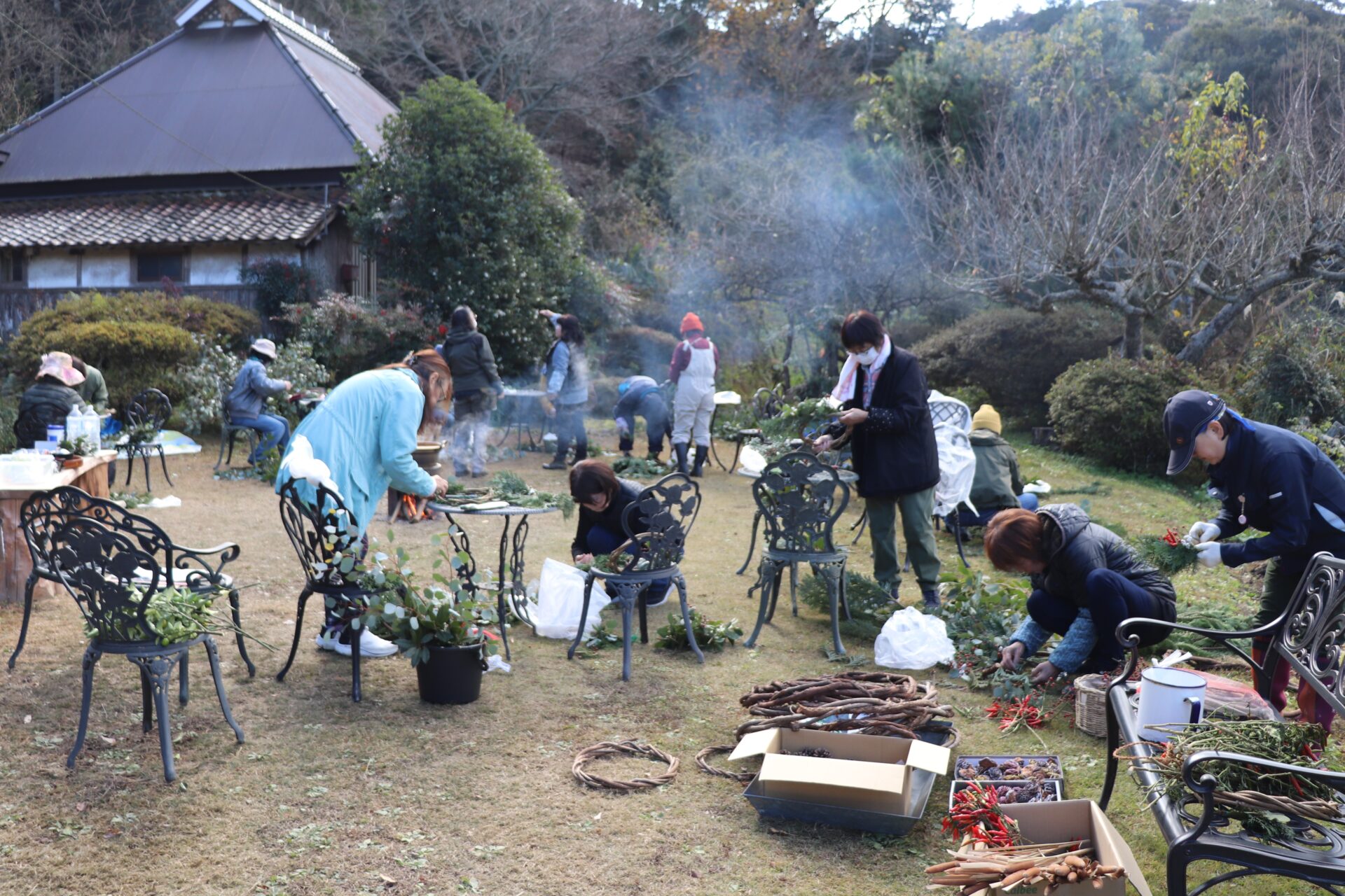 ヒノキ、ヒバ、ローズヒップ、蔓類などの里山資源を有効活用し、各自思い思いリースやスワッグづくりを楽しみました。
