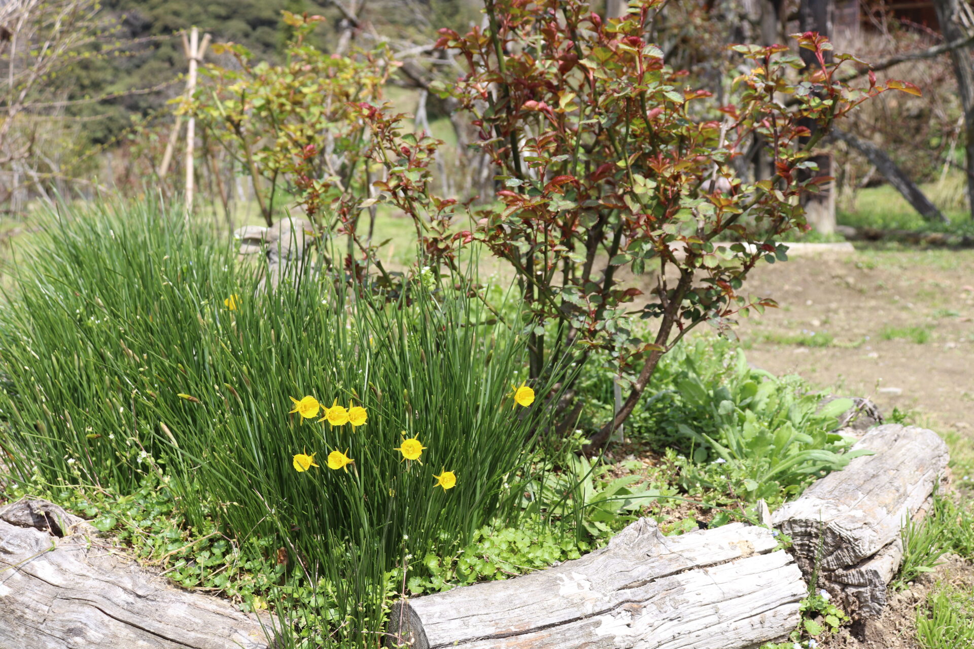 「里山ローズ」はソメイヨシノが満開、ヤマザクラやコウメが咲きはじめました。スイセンなどの草花も咲いて綺麗です。バラの新芽は大きく伸びバラゾウムシが活動を始めました。シマヘビも出てきて日向ぼっこをしています。